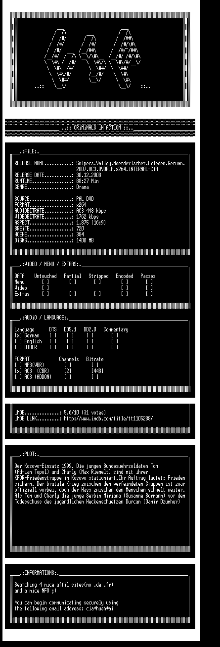 | FiLENAME: | Snipers Valley - Mörderischer Frieden (2007) [GER-AC3 WS DVD].mkv |
