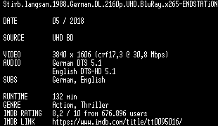 | FiLENAME: | Stirb.langsam.1988.German.DL.2160p.UHD.BluRay.x265-ENDSTATiON.mkv |