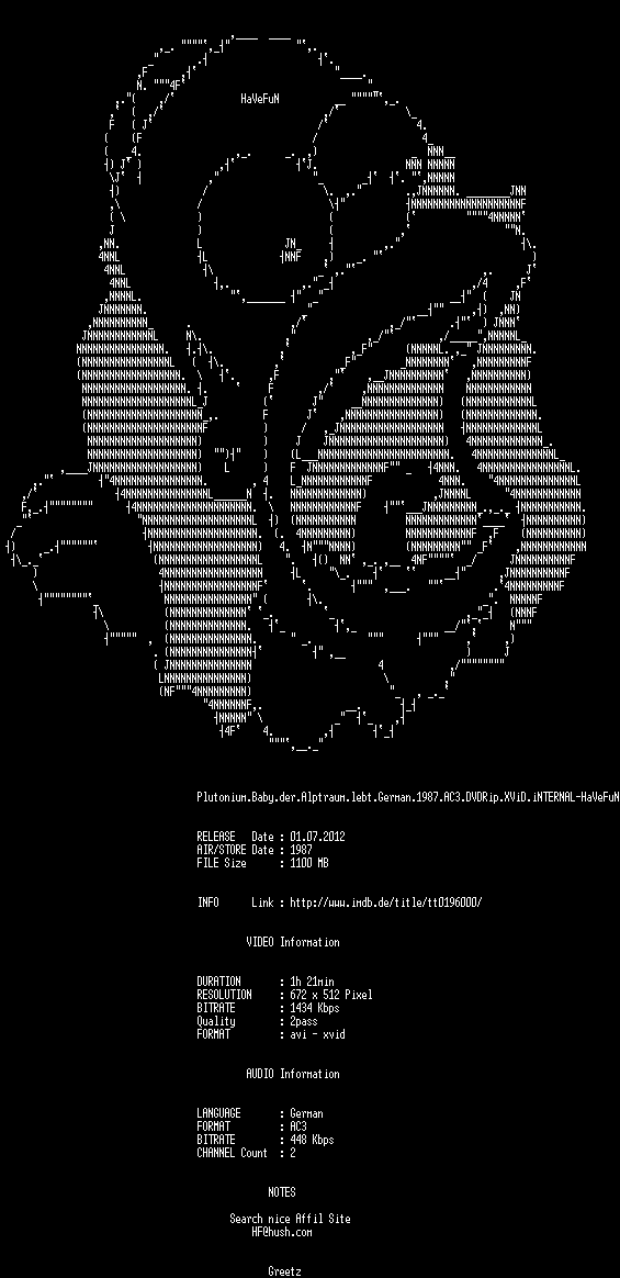 | FiLENAME: | Plutonium.Baby.der.Alptraum.lebt.German.1987.AC3.DVDRip.XViD.iNTERNAL-HaVeFuN.avi |