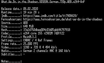 | FiLENAME: | What.We.Do.in.the.Shadows.S01E06.German.720p.WEB.x264-WvF.mkv |