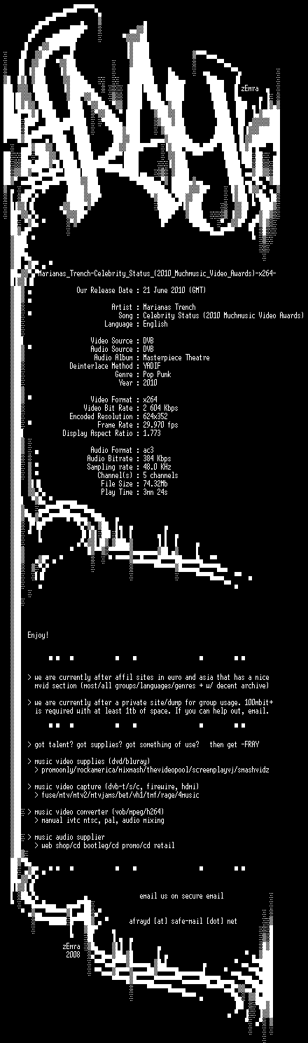 | FiLENAME: | Marianas_Trench-Celebrity_Status_(2010_Muchmusic_Video_Awards)-x264-2010-FRAY.mkv |