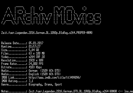 | FiLENAME: | Zeit.fuer.Legenden.2016.German.DL.1080p.BluRay.x264.PROPER-ARMO.mkv |