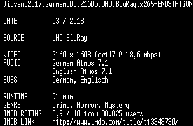 | FiLENAME: | Jigsaw.2017.German.DL.2160p.UHD.BluRay.x265-ENDSTATiON.mkv |