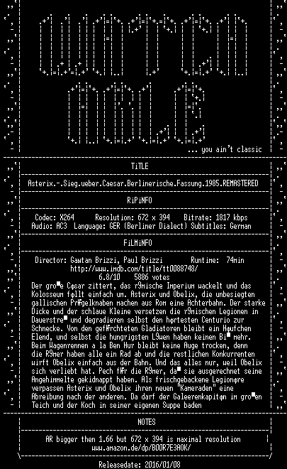 | FiLENAME: | Asterix.-.Sieg.ueber.Caesar.Berlinerische.Fassung.1985.REMASTERED.GERMAN.DVDRIP.X264.READ.NFO-WATCHABLE.mkv |