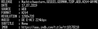 | FiLENAME: | Nachtschwestern.S01E01.GERMAN.720P.WEB.H264-WAYNE.mkv |
