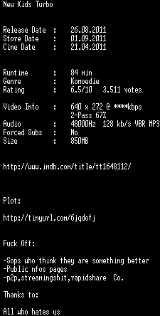 | FiLENAME: | New.Kids.Turbo.German.DVDRip.XviD-DiSTRiCT.avi |