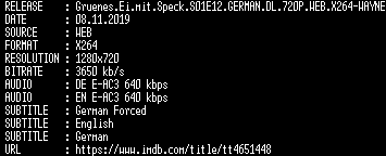 | FiLENAME: | Gruenes.Ei.mit.Speck.S01E12.GERMAN.DL.720P.WEB.X264-WAYNE.mkv |