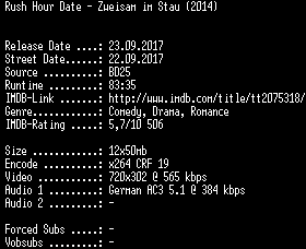 | FiLENAME: | Rush.Hour.Date.Zweisam.im.Stau.German.2014.AC3.BDRip.x264-SPiCY.mkv |