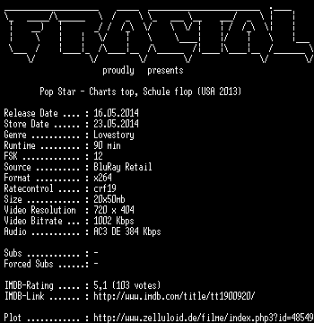 | FiLENAME: | Pop.Star.Charts.top.Schule.flop.German.2013.AC3.BDRip.x264-FRACTAL.mkv |