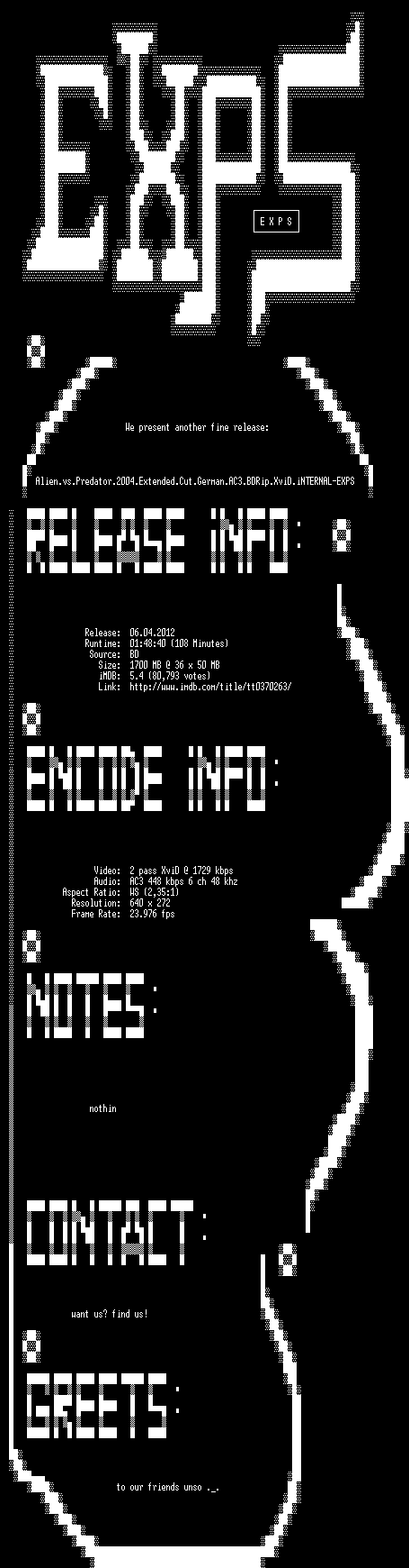 | FiLENAME: | Alien.vs.Predator.2004.Extended.Cut.German.AC3.BDRip.XviD.iNTERNAL-EXPS.avi |