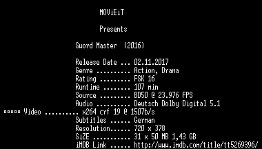 | FiLENAME: | Sword.Master.2016.German.BDRiP.x264-MOViEiT.mkv |
