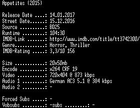 | FiLENAME: | Appetites.German.2015.AC3.BDRip.x264-SPiCY.mkv |