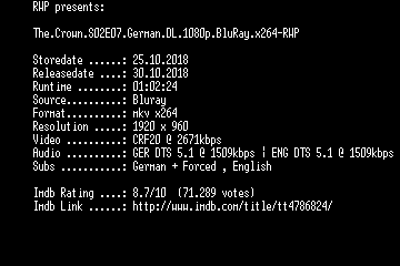 | FiLENAME: | The.Crown.S02E07.German.DL.1080p.BluRay.x264-RWP.mkv |