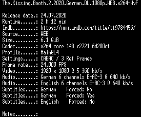 | FiLENAME: | The.Kissing.Booth.2.2020.German.DL.1080p.WEB.x264-WvF.mkv |