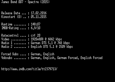 | FiLENAME: | James.Bond.007.Spectre.2015.German.DTS.DL.1080p.BluRay.x264-EXQUiSiTE.mkv |