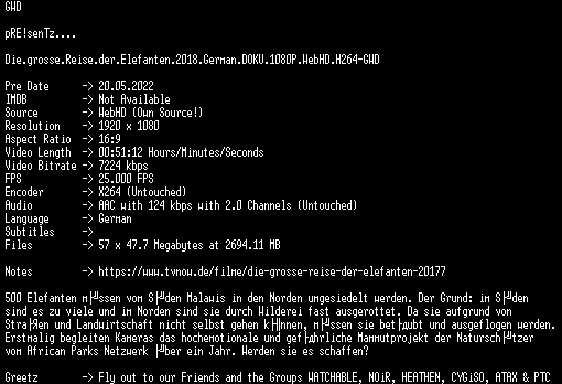 | FiLENAME: | Die.grosse.Reise.der.Elefanten.2018.German.DOKU.1080P.WebHD.H264-GWD.mkv |