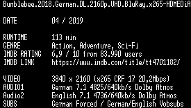 | FiLENAME: | Bumblebee.2018.German.DL.2160p.UHD.BluRay.x265-HDMEDiA.mkv |