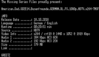 | FiLENAME: | American.Dad.S02E14.Busenfreunde.GERMAN.DL.FS.1080p.HDTV.x264-TMSF.mkv |