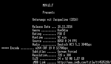 | FiLENAME: | Unterwegs.mit.Jacqueline.German.2016.AC3.BDRip.x264-MOViEiT.mkv |