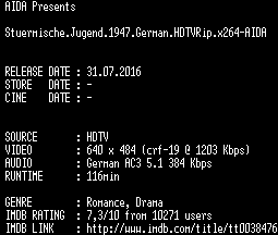 | FiLENAME: | Stuermische.Jugend.1947.German.HDTVRip.x264-AIDA.mkv |