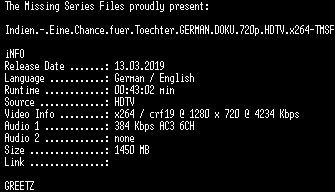 | FiLENAME: | Indien.-.Eine.Chance.fuer.Toechter.GERMAN.DOKU.720p.HDTV.x264-TMSF.mkv |