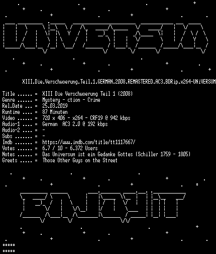 | FiLENAME: | XIII.Die.Verschwoerung.Teil.1.GERMAN.2008.REMASTERED.AC3.BDRip.x264-UNiVERSUM.mkv |
