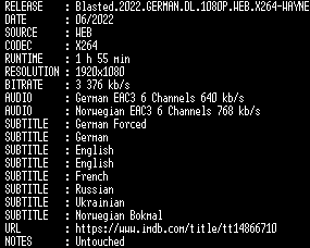 | FiLENAME: | Blasted.2022.GERMAN.DL.1080P.WEB.X264-WAYNE.mkv |