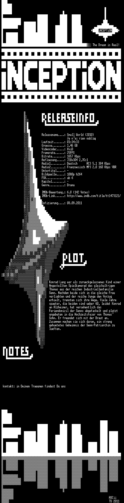 | FiLENAME: | Small.World.2010.German.AC3.DL.HDRip.XviD-iNCEPTiON.avi |