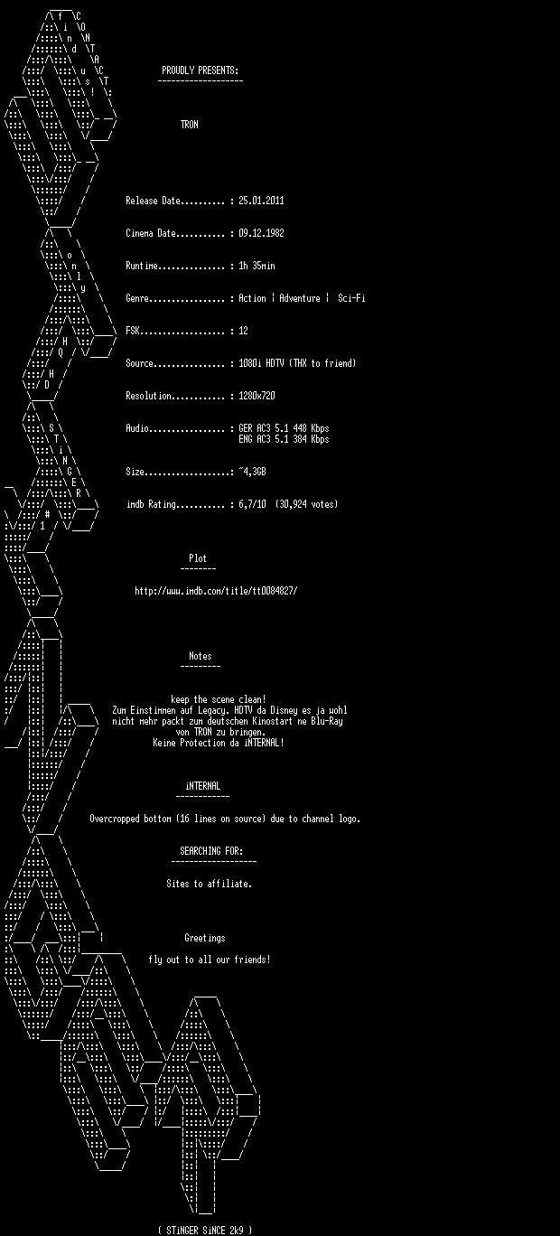| FiLENAME: | TRON.1982.German.AC3D.DL.720p.HDTV.iNTERNAL.x264-STiNGER.mkv |