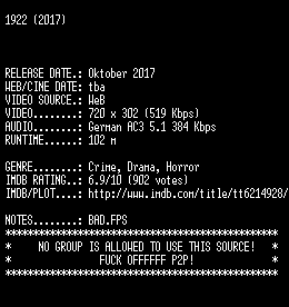 | FiLENAME: | 1922.2017.German.AC3D.WebRip.x264.REPACK-SLG.mkv |