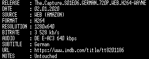 | FiLENAME: | The.Capture.S01E06.GERMAN.720P.WEB.H264-WAYNE.mkv |