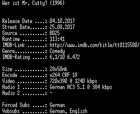 | FiLENAME: | Wer.ist.Mr.Cutty.German.REMASTERED.1996.AC3.BDRip.x264-SPiCY.mkv |