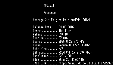 | FiLENAME: | Hostage.2.Es.gibt.kein.zurueck.German.2012.AC3.BDRip.x264-MOViEiT.mkv |