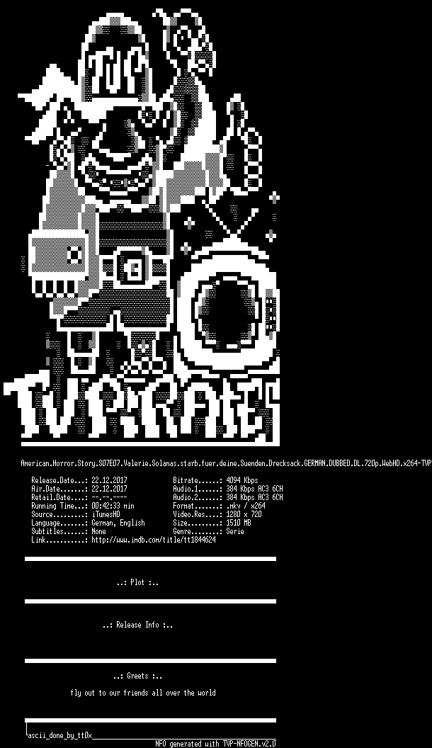 | FiLENAME: | American.Horror.Story.S07E07.Valerie.Solanas.starb.fuer.deine.Suenden.Drecksack.GERMAN.DUBBED.DL.720p.WebHD.x264-TVP.mkv |