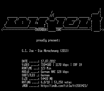 | FiLENAME: | G.I.Joe.Die.Abrechung.2013.German.BDRip.x264-CONFiDENT.mkv |
