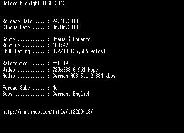 | FiLENAME: | Before.Midnight.German.BDRiP.x264-EXQUiSiTE.mkv |