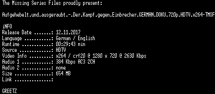 | FiLENAME: | Aufgehebelt.und.ausgeraubt.-.Der.Kampf.gegen.Einbrecher.GERMAN.DOKU.720p.HDTV.x264-TMSF.mkv |