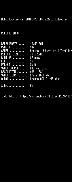 | FiLENAME: | Moby.Dick.German.2010.AC3.BDRip.XviD-VideoStar.avi |