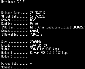 | FiLENAME: | Metalfarm.German.2017.AC3.BDRip.x264-SPiCY.mkv |