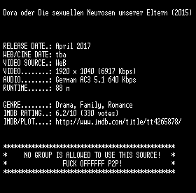 | FiLENAME: | Dora.oder.Die.sexuellen.Neurosen.unserer.Eltern.2015.German.1080p.WebHD.x264-SLG.mkv |