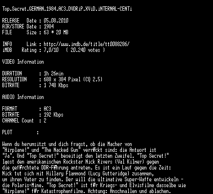 | FiLENAME: | Top.Secret.GERMAN.1984.AC3.DVDRiP.XViD.iNTERNAL-CENTi.avi |