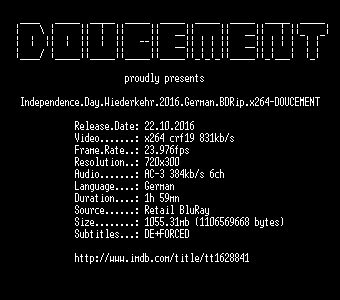 | FiLENAME: | Independence.Day.Wiederkehr.2016.German.BDRip.x264-DOUCEMENT.mkv |