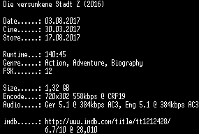 | FiLENAME: | Die.versunkene.Stadt.Z.German.2016.DL.BDRiP.x264-CiNEViSiON.mkv |