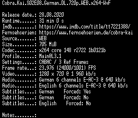 | FiLENAME: | Cobra.Kai.S02E08.German.DL.720p.WEB.x264-WvF.mkv |