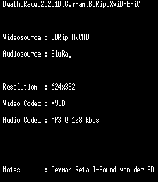 | FiLENAME: | Death.Race.2.2010.German.BDRip.XviD-EPiC.avi |
