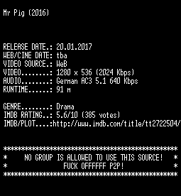 | FiLENAME: | Mr.Pig.2016.German.720p.WebHD.x264-SLG.mkv |