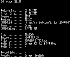 | FiLENAME: | 24.Wochen.German.2016.AC3.BDRip.x264-SPiCY.mkv |