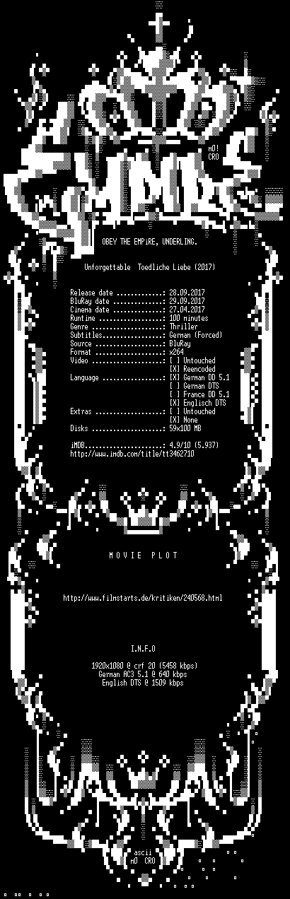 | FiLENAME: | Unforgettable.Toedliche.Liebe.German.DL.1080p.BluRay.x264-EmpireHD.mkv |