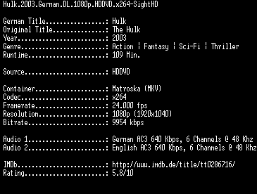 | FiLENAME: | Hulk.2003.German.DL.1080p.HDDVD.x264-SightHD.mkv |