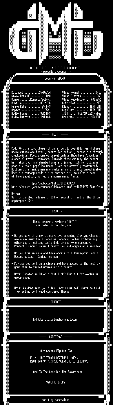 | FiLENAME: | Code.46.LIMITED.DVDRip.XviD-DMT.avi |